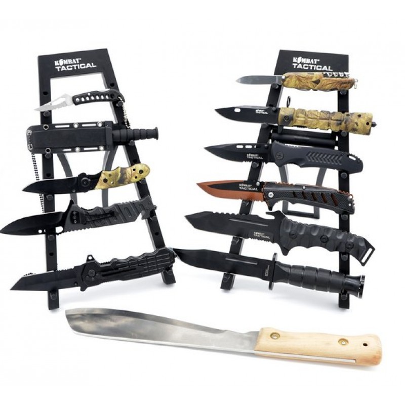 Samostojeći modularni plastični stalak za noževe sa Kombat UK logo-om.